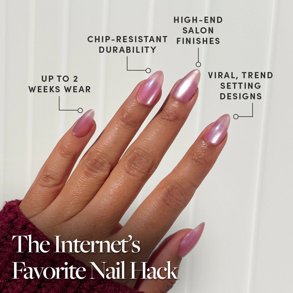 Channel your inner siren with the Seaspell Press-On Nail Set. Drenched in a dreamy pink shade and a shimmering velvet finish, these short almond nails capture the elegance of underwater mermaids. Seaspell is a cooler-toned pink with soft lavender undertones, giving it a slight bluish appearance. Perfect for summer nights and tropical vacations, you’ll have anyone under your spell for up to 2 weeks.