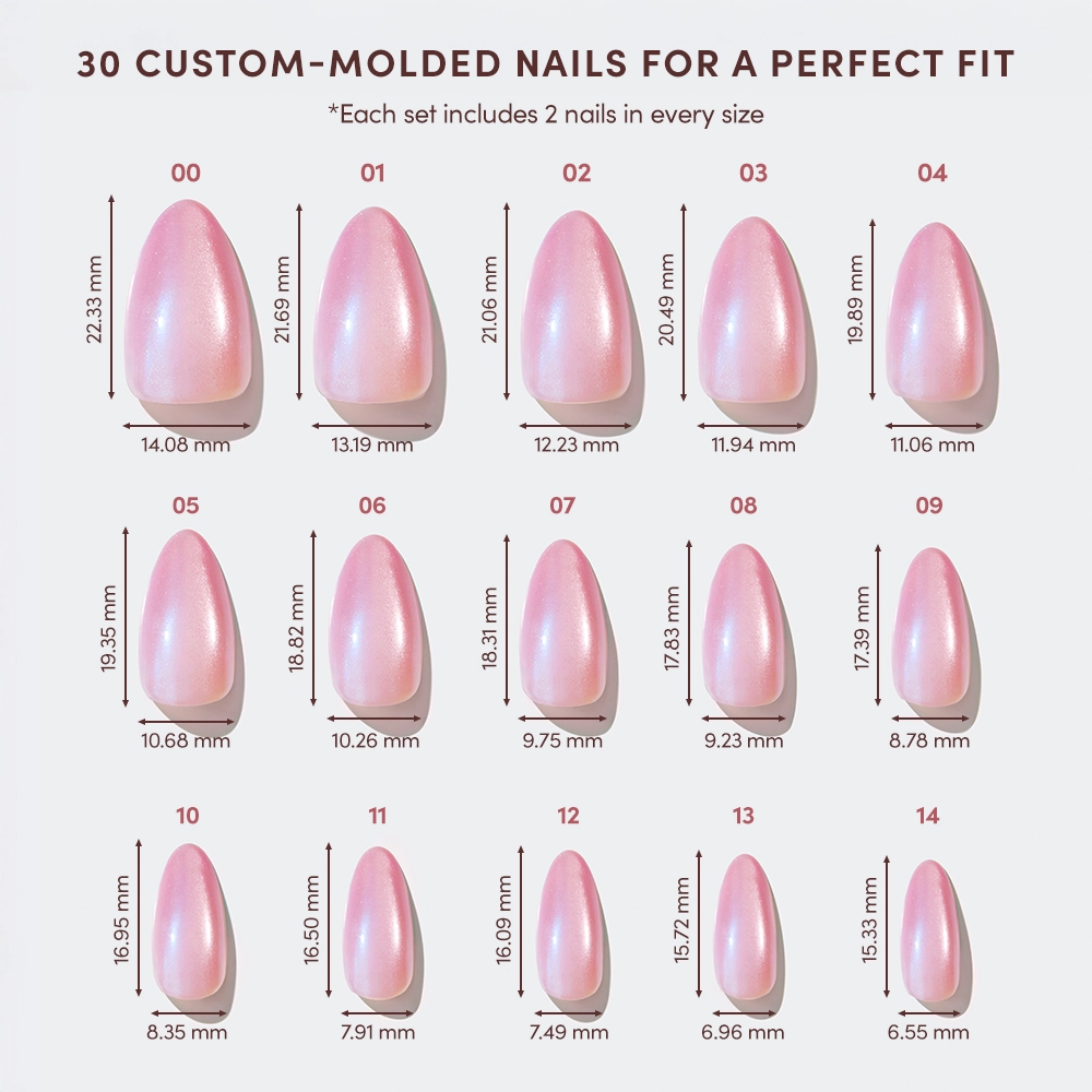 The great part about our nails is that they come in many different sizes. Our kits that come with 24 nails include 12 different sizes and our kits that come with 30 nails include 15 different sizes. Please know that you are also able to shape all the nails so that they fit perfectly. Also, the width of our nails can range from 6.3 mm - 14.02 mm.